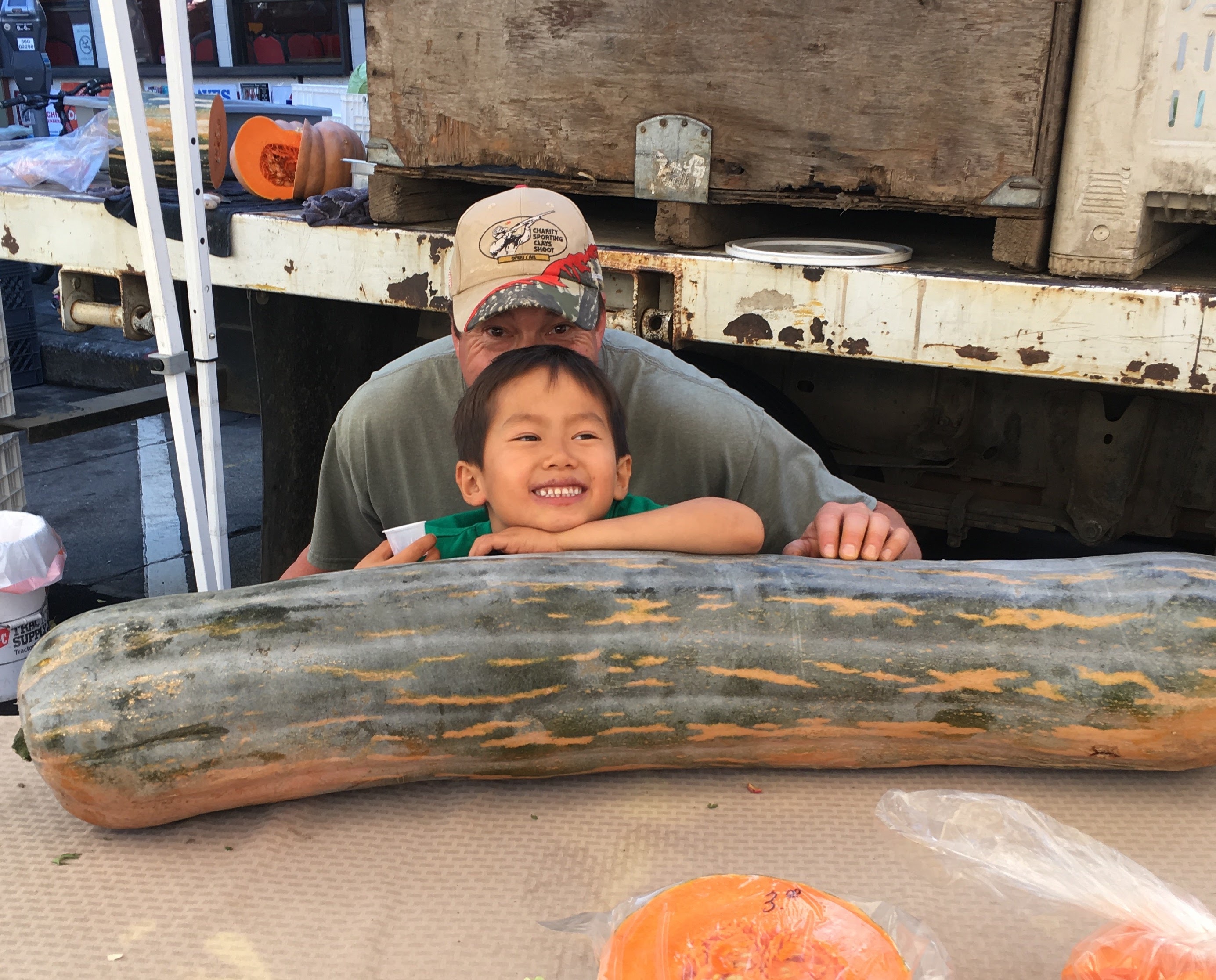 Take time to engage in conversation with the vendors and farmers to find out more about how the produce is grown, where in the world it came from originally, and the names of different foods. One veggie that we had never encountered before is this giant squash, pictured left, with Brad.