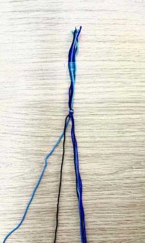 Step two: Pick a color to start with. Using your starting color’s strand, make a forward knot around the rest of the strands.