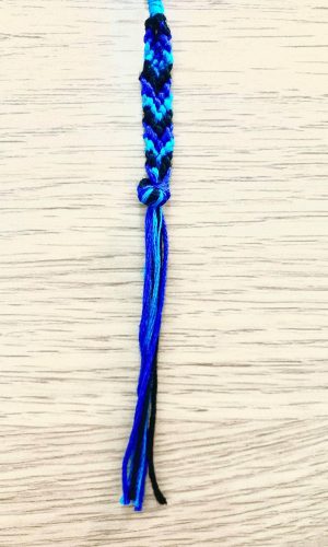 Step seven: To finish your bracelet, tie a knot as close to the patterned rows as possible. Leave a three-inch tail and cut.