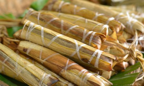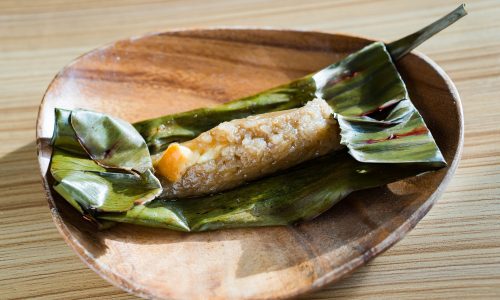 Step five: Remove rice from heat and cool. Place about two to three tablespoons of rice on a banana leaf, leaving about one inch of empty space on each side. Roll banana leaves tightly around the rice to form a log and fold both edges to seal. You can also tie it with banana leaf strips. Congratulations, you’ve just formed suman!
