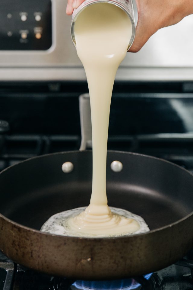 Step two: Once the butter is melted, add 14 oz of sweetened condensed milk and stir. Keep in mind, you’ll be stirring continuously now and you don’t want to step away for long. Keeping a close eye will help it not burn.