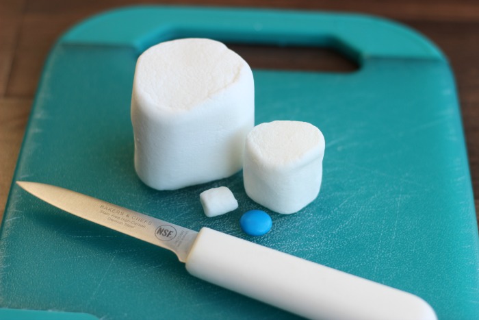 Step 2: Cut giant marshmallow in half. Cut jumbo marshmallow into thirds. Discard top and bottom piece, leaving only the middle piece that is sticky on both sides. Cut miniature marshmallow in half.