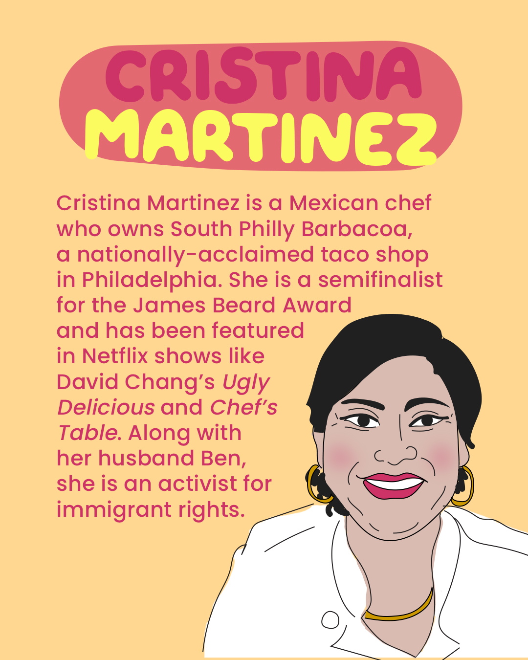 Cristina Martinez is a Mexican chef who owns South Philly Barbacoa, a nationally-acclaimed taco shop in Philadelphia. She is a semifinalist for the James Beard Award and has been featured in Netflix shows like David Chang’s Chef’s Table and Ugly Delicious. Along with her husband Ben, she is an activist for immigrant rights.