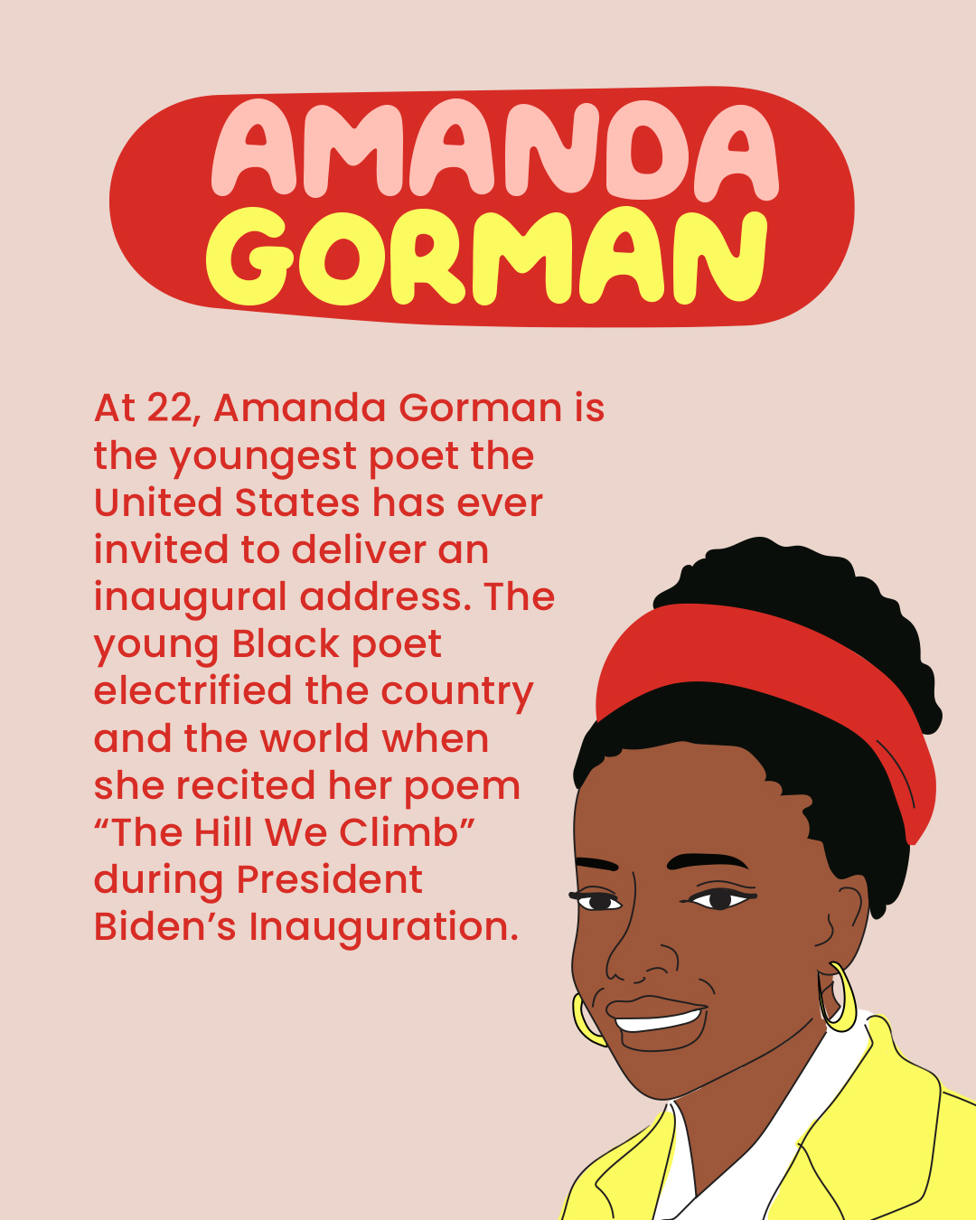 At 22, Amanda Gorman is the youngest poet the United States has ever invited to deliver an inaugural address. The young Black poet electrified the country and the world when she recited her poem “The Hill We Climb” during President Biden’s inauguration. Raised in Los Angeles, she would write in journals at the school playground. She was named the Youth Poet Laureate of Los Angeles at 16. She studied sociology at Harvard and became the National Youth Poet Laureate, the first person to hold the position.