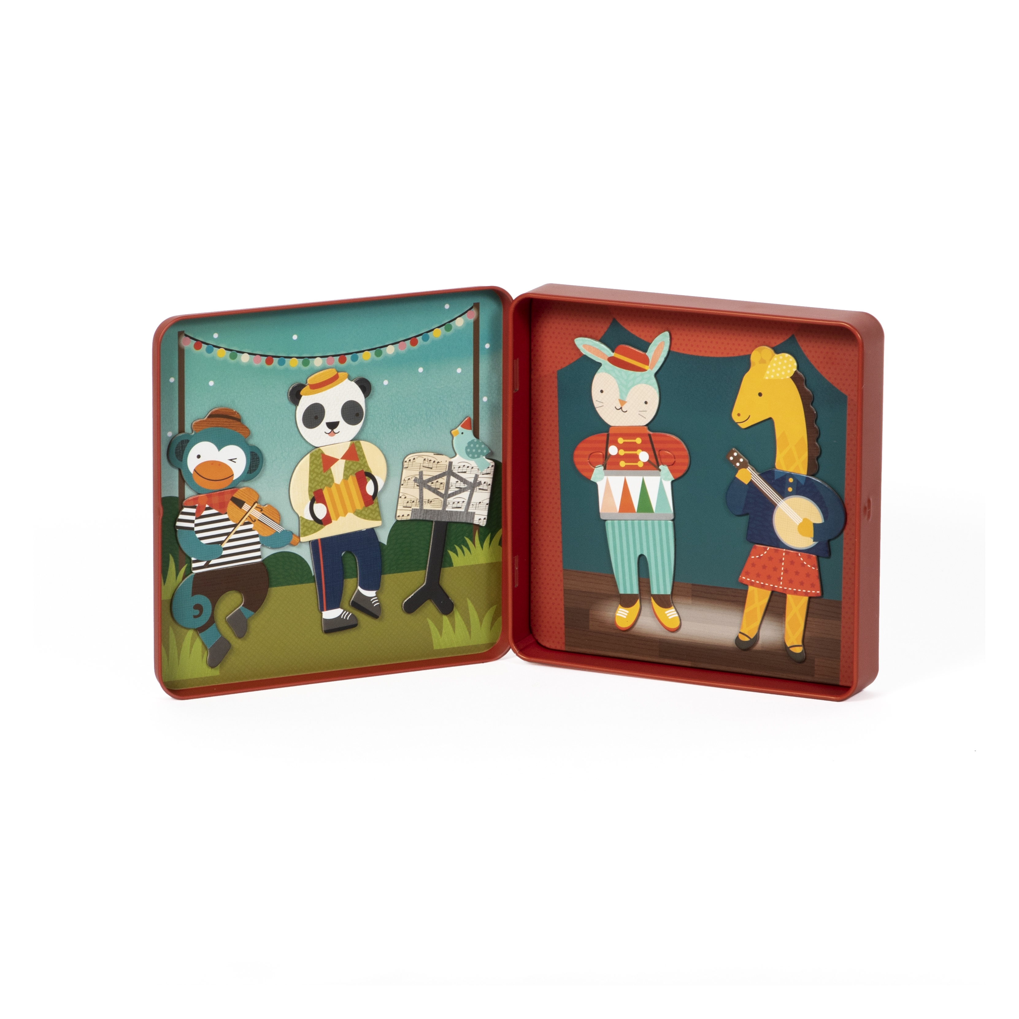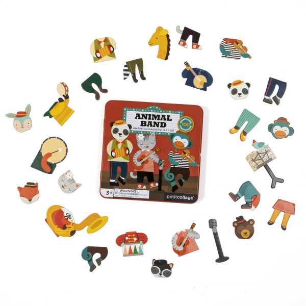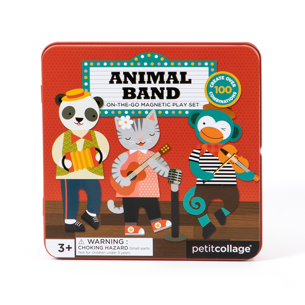 Tune up your little musician’s creativity with this fun-to-use magnetic play set. Children can mix and match over 25 magnetic pieces to create different animal characters. This play set encourages fine motor development, storytelling and character building. The magnetic storage tin features two full color backgrounds to inspire imaginative play. This set is great for on-the-go play, from home, in the car or on the sold-out tour bus.