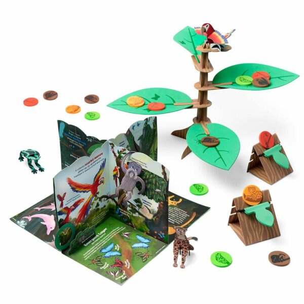 Discover the Amazon with a beautiful, fact-packed pop-up playset exploring the layers of the rainforest. Then have a blast launching illustrated animal disks into the branches of a giant kapok tree while playing Rainforest Romp.