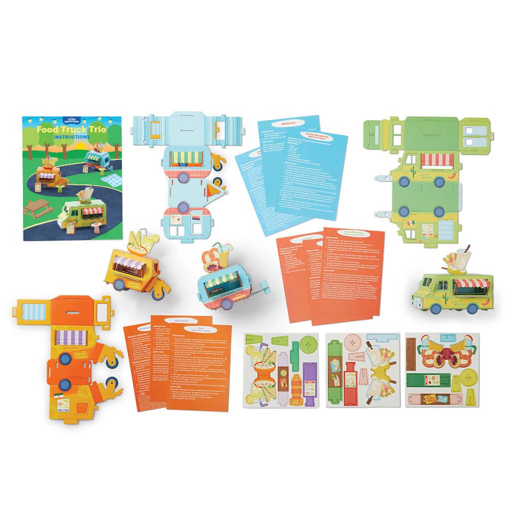 Take a tasty road trip and make a trio of play food trucks with this hands-on introduction to international eats. Start by building three country-themed food trucks to create your own fun-filled global food court. Then head to your kitchen and whip up nine authentic, mouthwatering street food favorites. Discover how India’s diversity led to dishes like the Bombay Chutney Sandwich and Nimbu Soda, and explore how family recipes shape Elotes Mexicanos and German Pancakes. With step-by-step recipes for sweet and savory foods and three delicious drinks, this kit makes playing food truck and discovering new cultures as easy as 1-2-3!