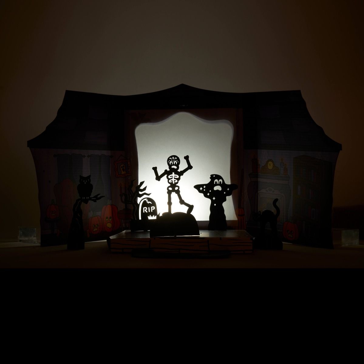 Perform chilling Halloween stories with a spooky shadow theater you build yourself! Set the stage with 12 creepy shadow puppets and props, dim the lights, and let the show begin! Will the tale be scary or silly? Should the witch be a hero or a villain? You decide!