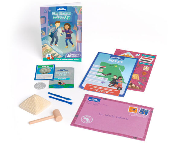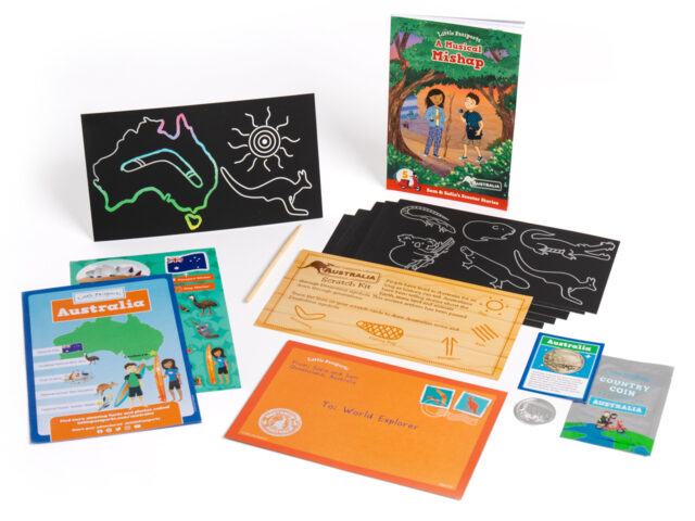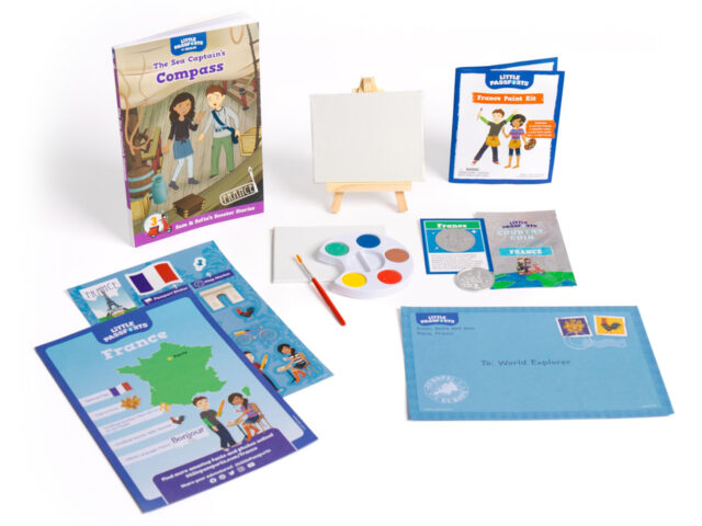 - Your very own signature blue suitcase, passport and stamp, wall-sized world map, and stickers